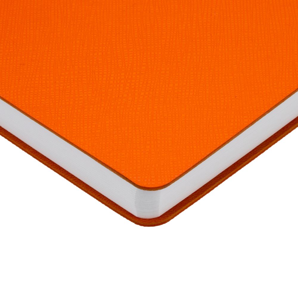 Ежедневник с гибкой обложкой выполнена из материала Nice Touch, оранжевый и Latte, оранжевый (внутренняя часть обложки), дополнен горизонтальной резинкой в цвет обложки. Внутри корешка — специальное место для крепления ручки размером до 15х1 см.