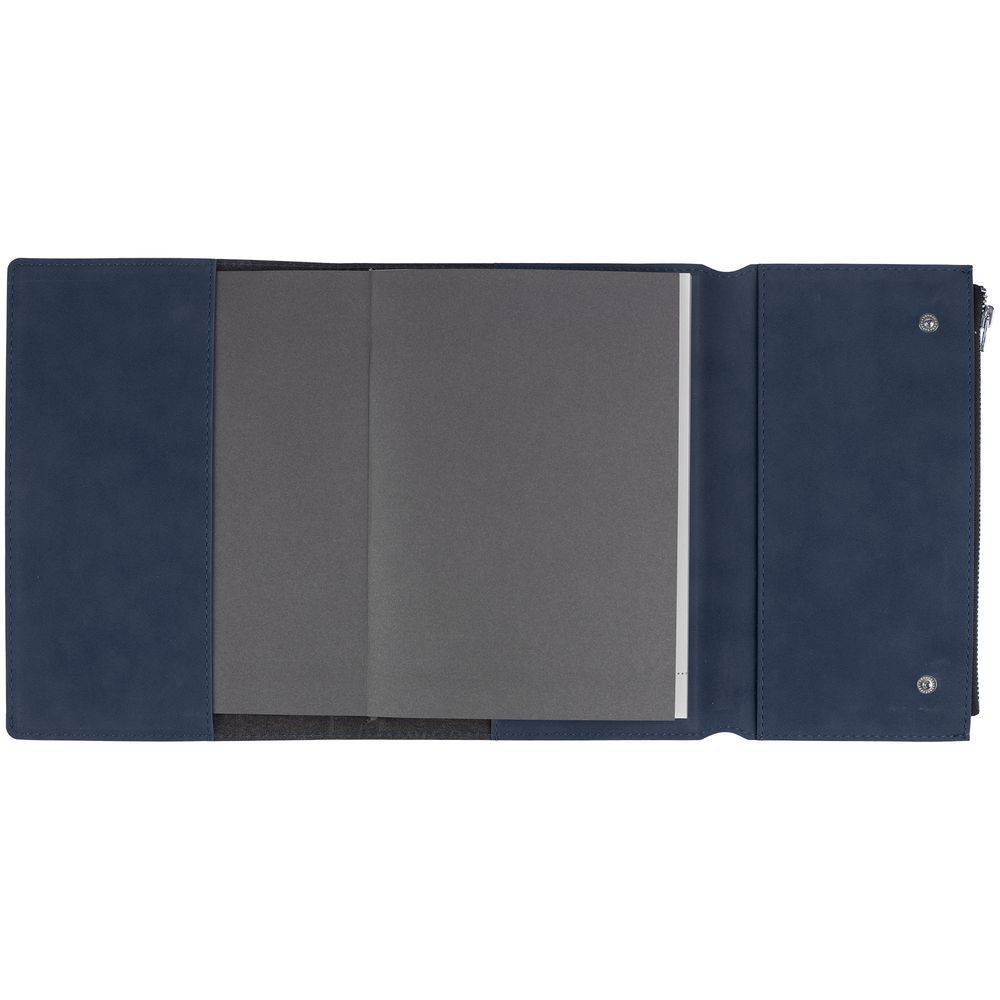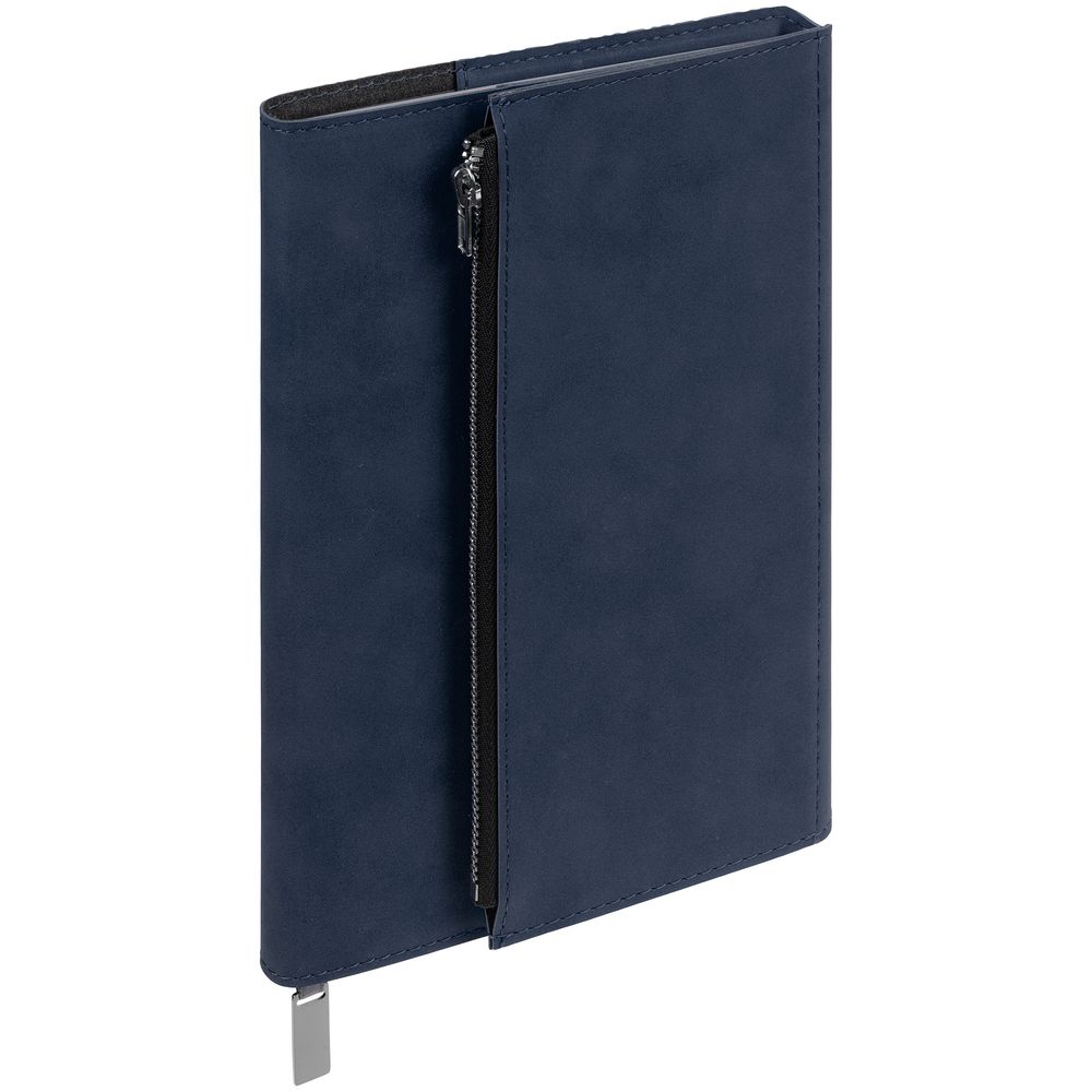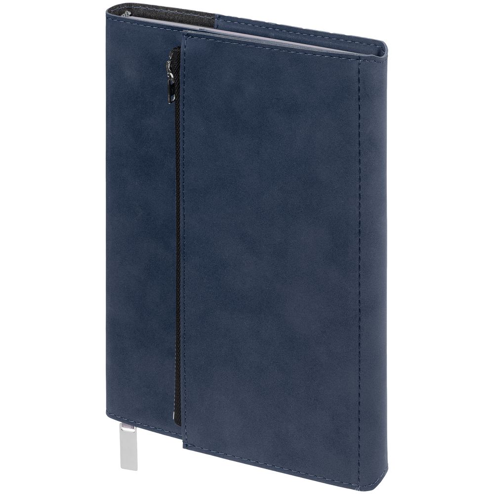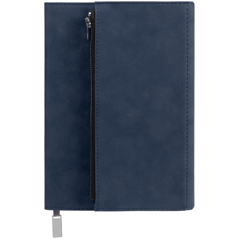Ежедневник в гибкой суперобложке c карманом на молнии, выполнен из материала Nubuck, темно-синий ХХ. Дополнен капталом и металлической шильдой на ляссе серого цвета.