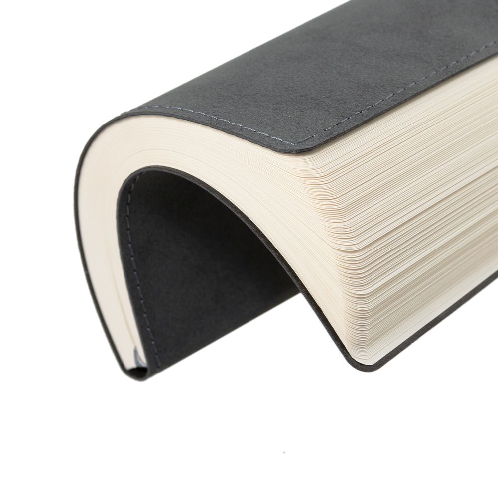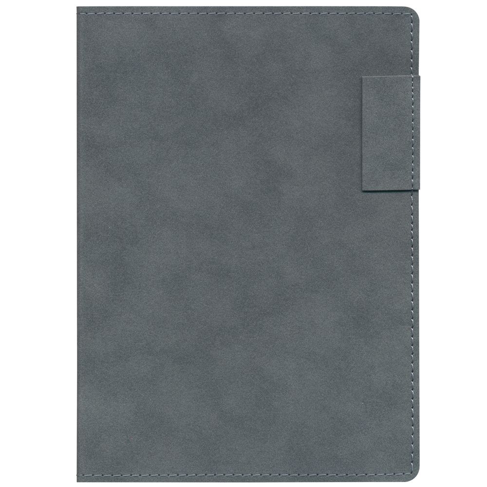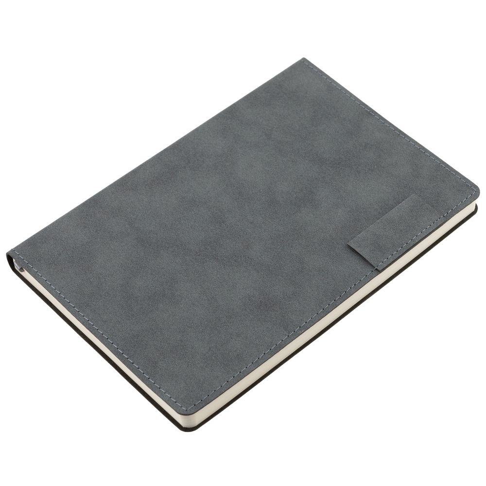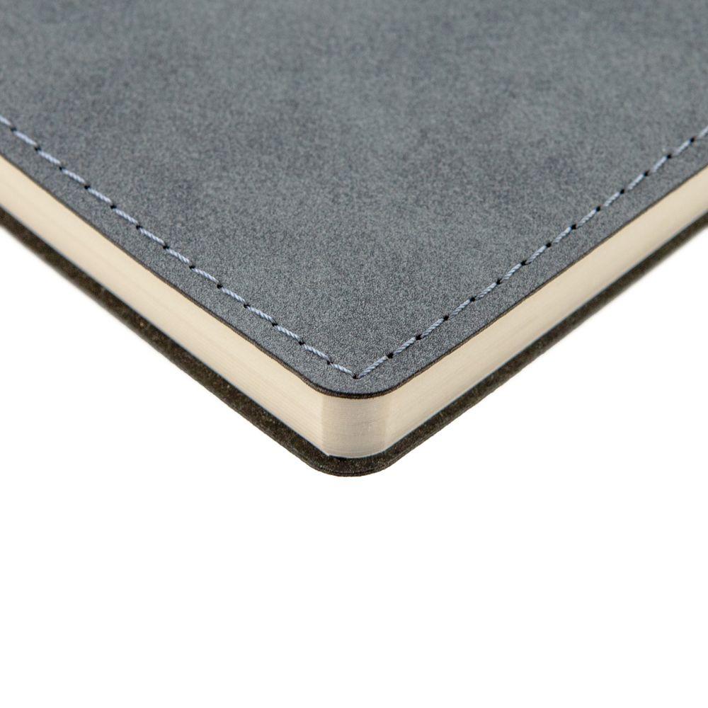 Ежедневник с гибкой обложкой, выполнен из материала Nubuck, темно-серый ЕЕ, дополнен петлей-лейблом для ручки и ляссе в цвет материала.