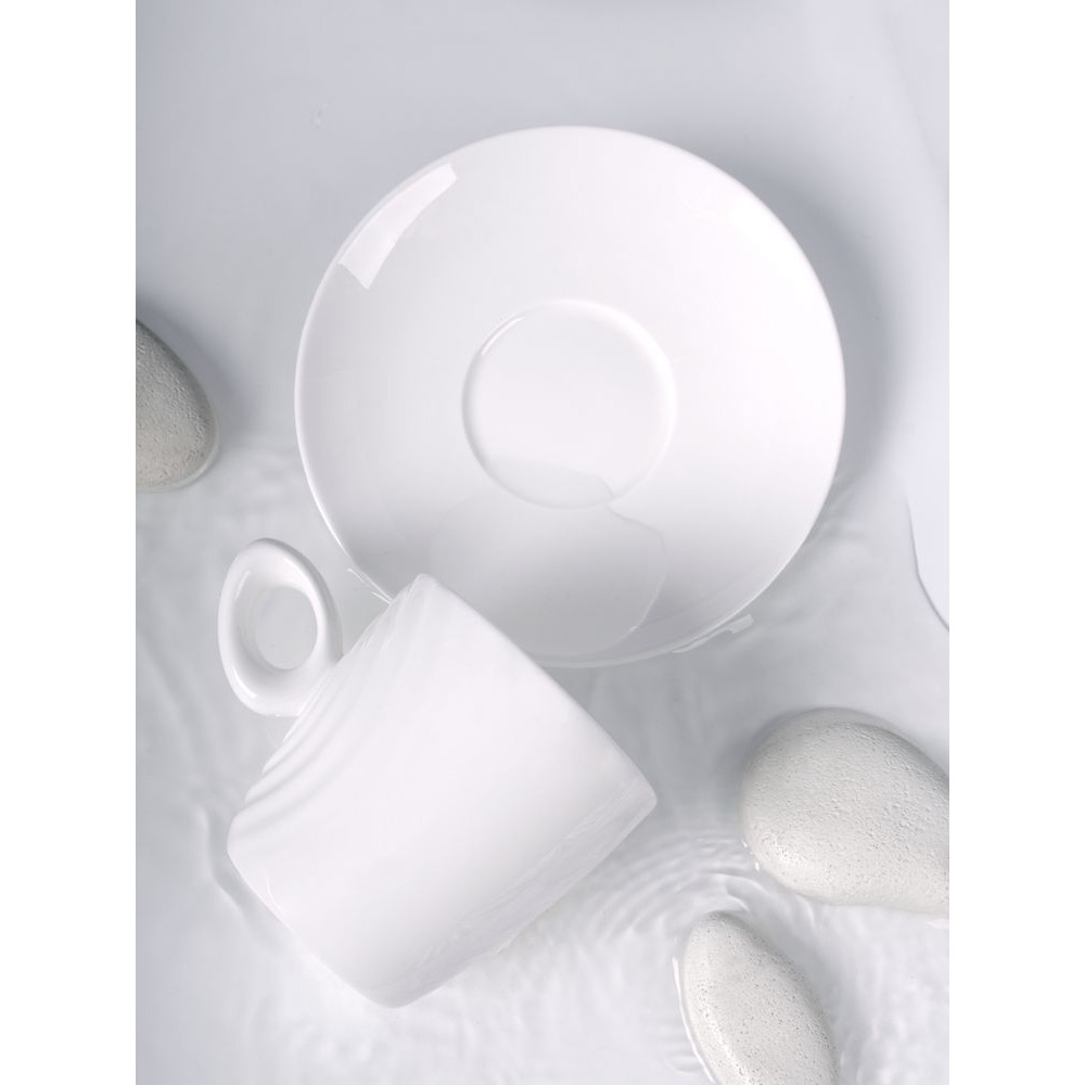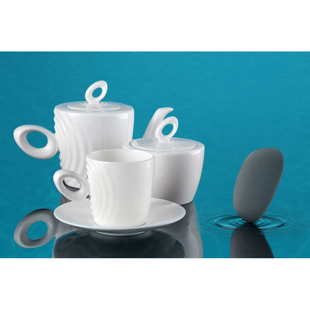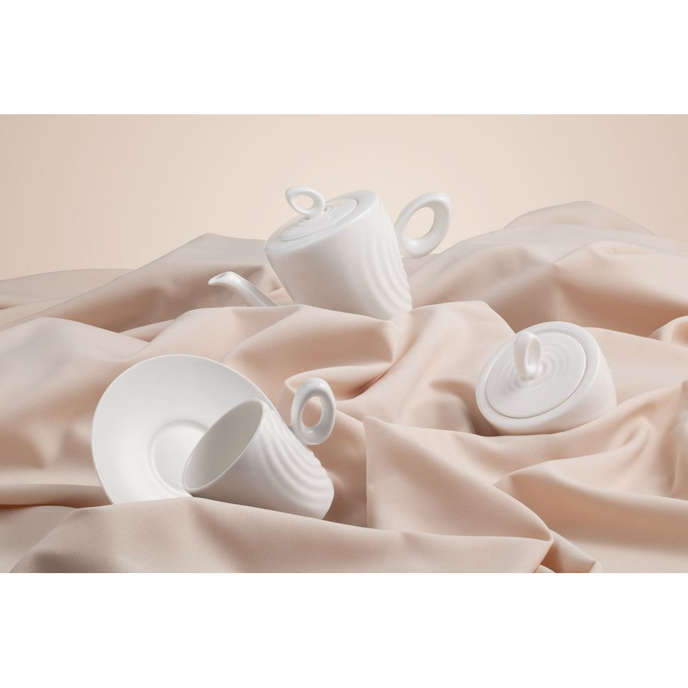 Посуда выполнена из костяного фарфора, что делает ее необычайно легкой и прочной одновременно. При этом благодаря биоморфическим формам кажется, что твердый материал становится мягким и податливым.