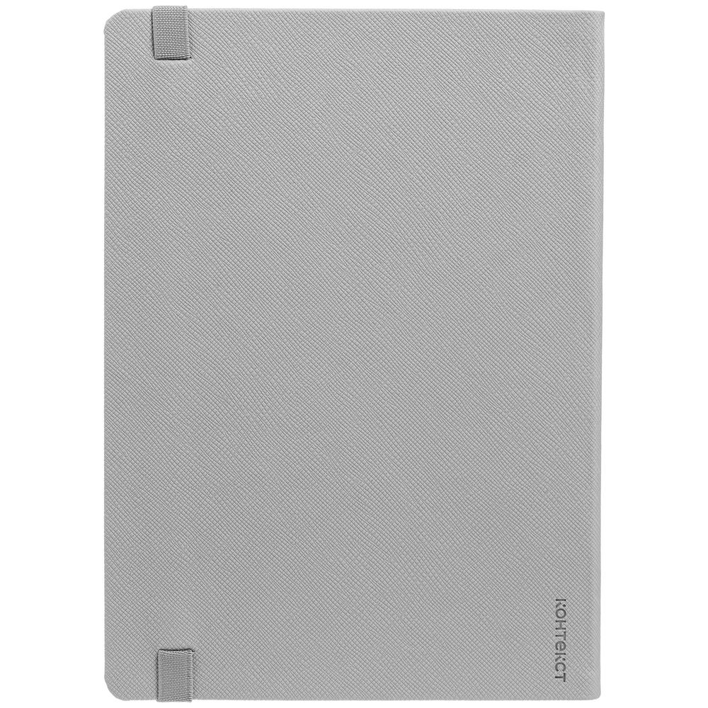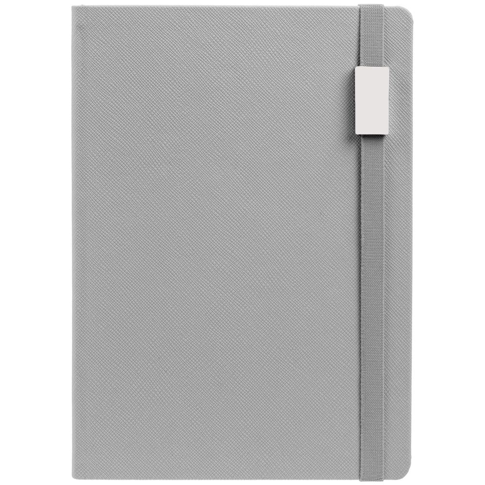 Ежедневник с полутвердой обложкой выполнен из материала Nice Touch, серый СС, и дополнен резинкой шириной 1 см с металлическим шильдом и ляссе серого цвета.