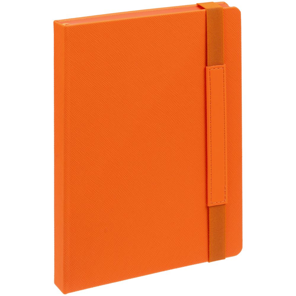 Ежедневник с твердой обложкой, выполнен из материала Nice Touch, оранжевый ОО, дополнен резинкой с лейблом из материала Soft Touch и ляссе в цвет обложки.