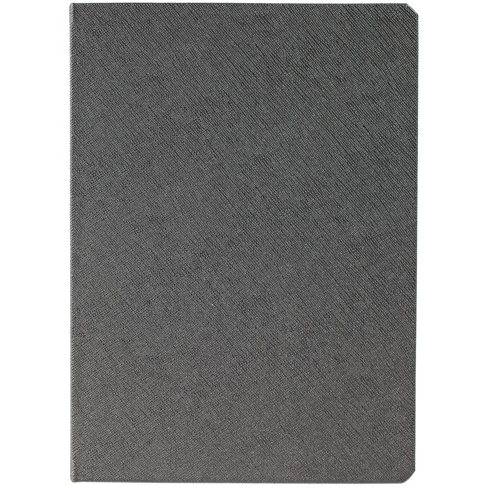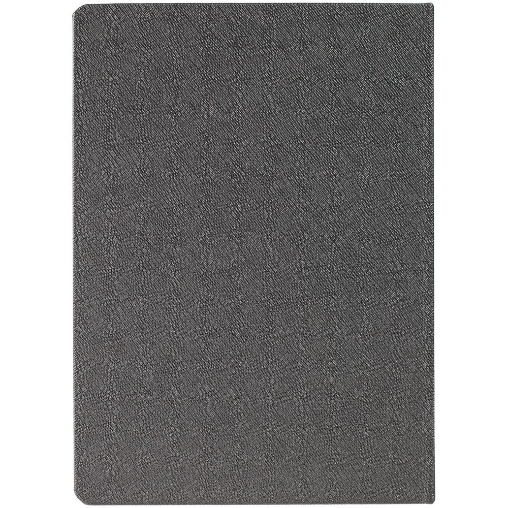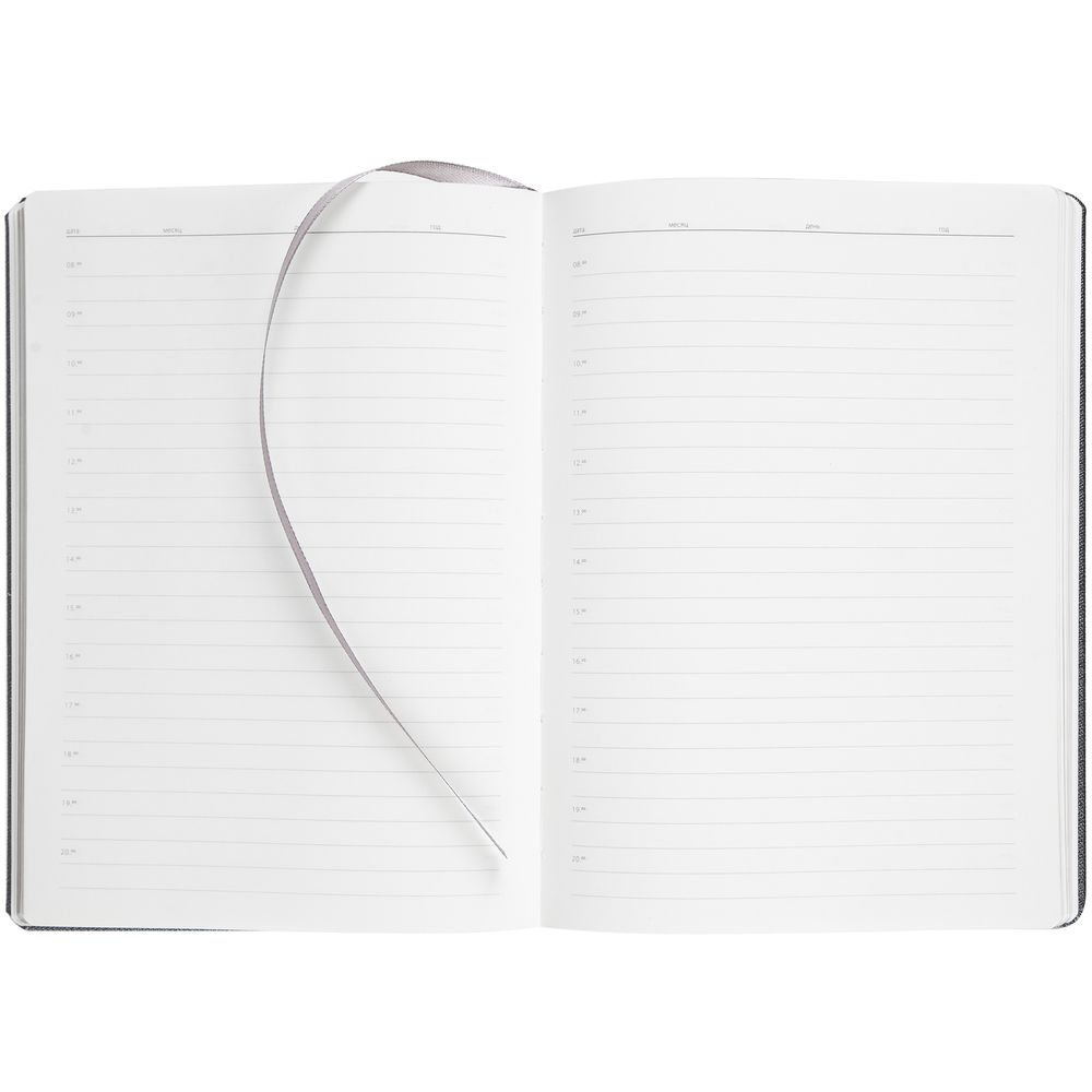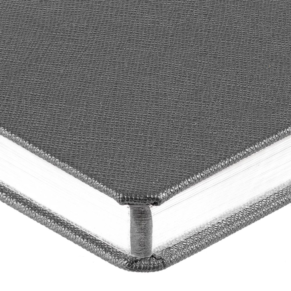 Ежедневник с твердой обложкой и серебристым обрезом, выполнен из материала Saffian, темно-серый, дополнен ляссе в цвет обложки.
