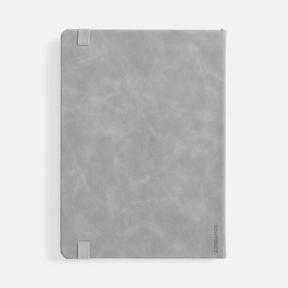 Ежедневник с твердой обложкой, выполнен из материала Nubuck Touch, серый СС, дополнен ляссе темно-серого цвета.