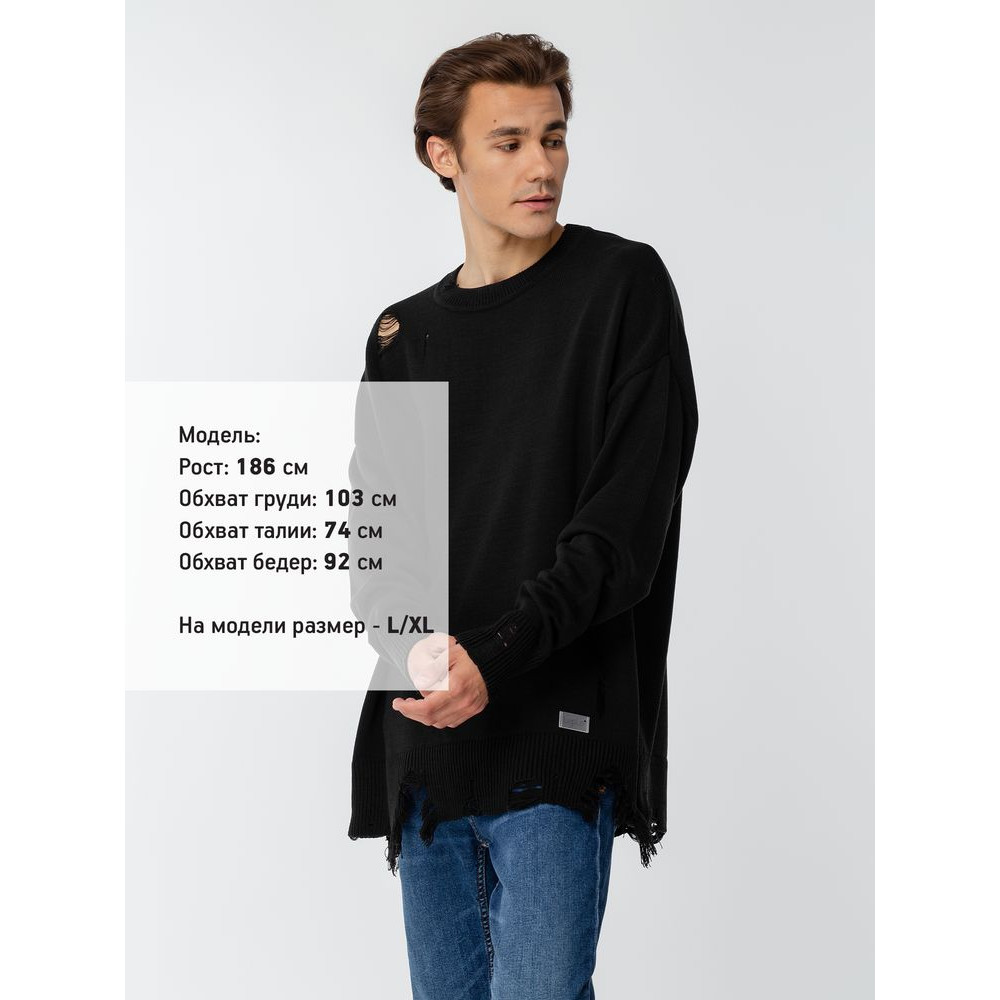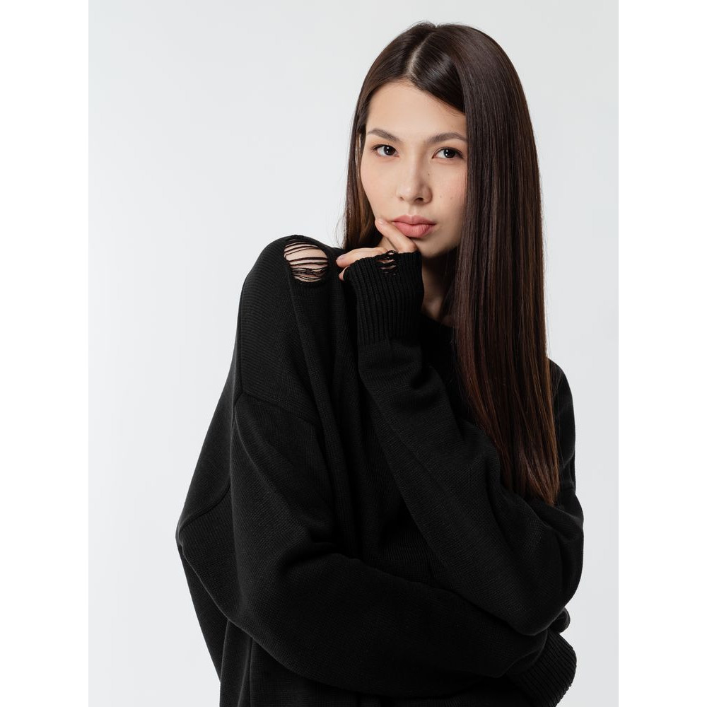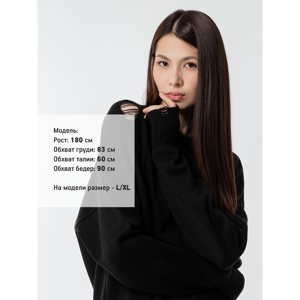 Оверсайз джемпер с круглым вырезом и рваными краями. Ворот, манжеты и низ изделия выполнены резинкой.