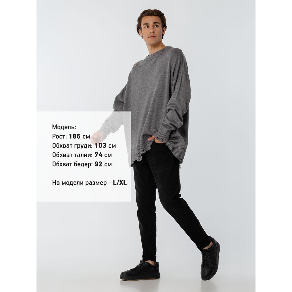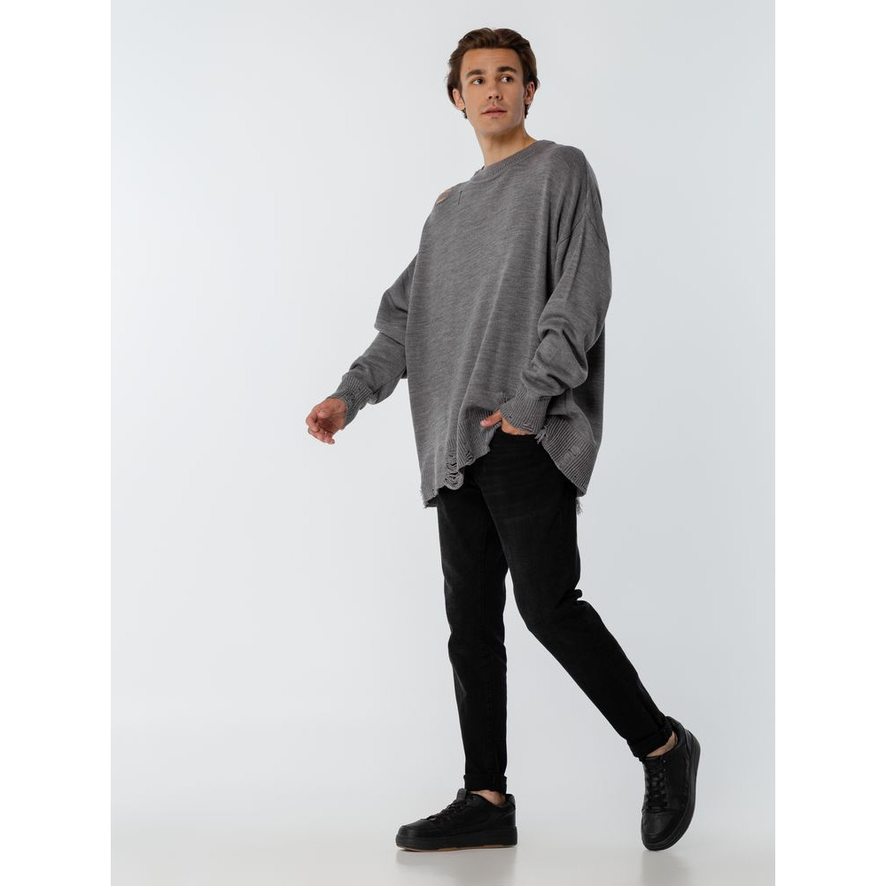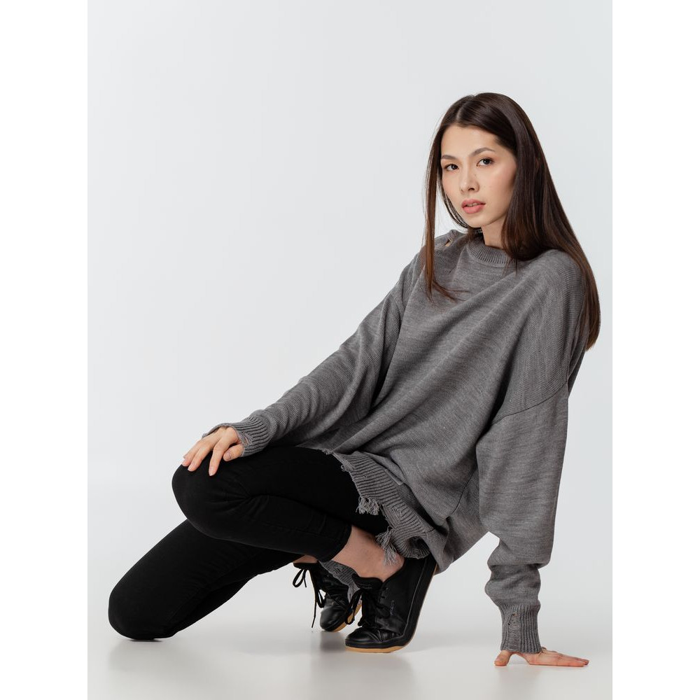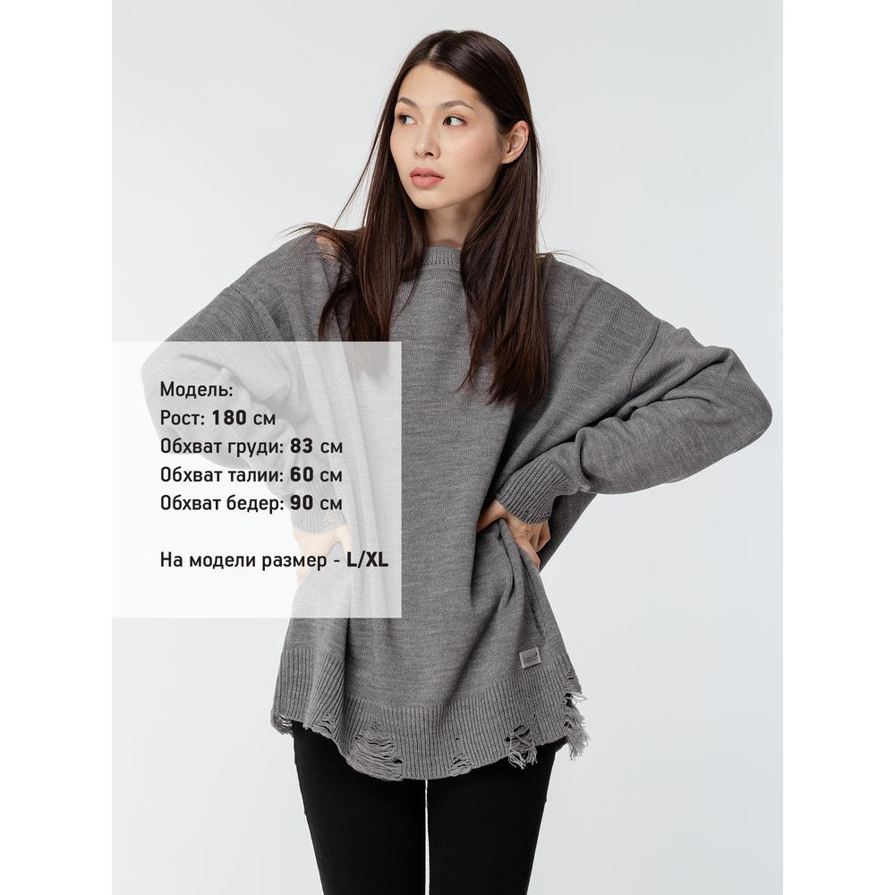 Оверсайз джемпер с круглым вырезом и рваными краями. Ворот, манжеты и низ изделия выполнены резинкой.