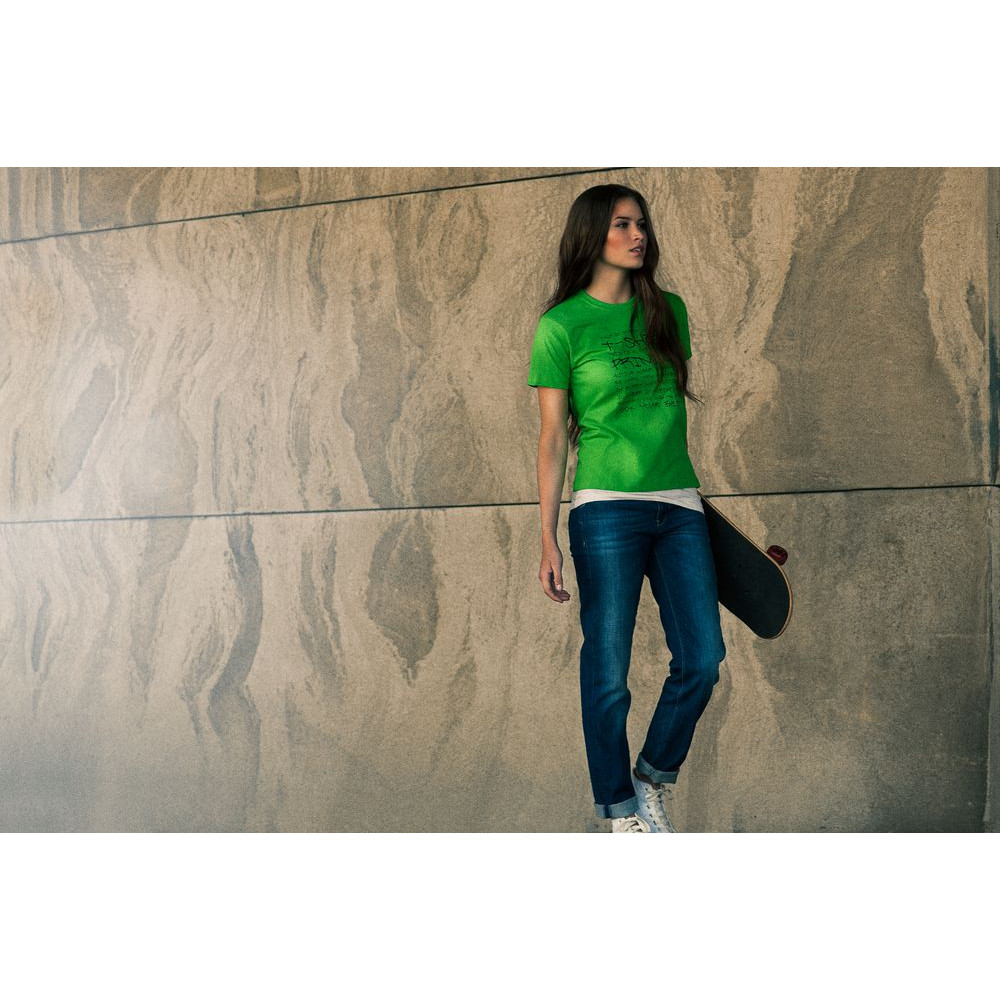 Женская футболка с уплотненными швами на плечах и двойным швом с эластаном. Четырехслойная резинка на воротнике предохраняет его от растяжения.