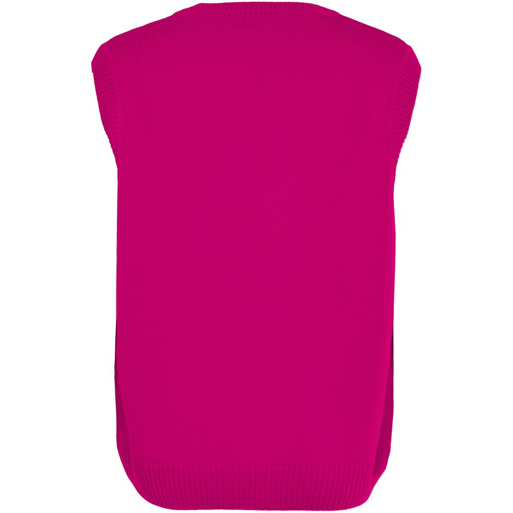 Жилет оверсайз с вывязанным логотипом и индивидуальным рисунком в фирменной цветовой гамме.