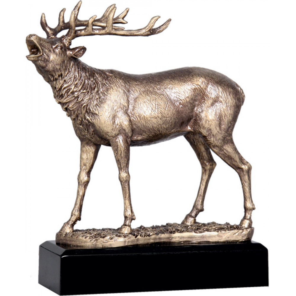 Фигурка литая "Охота". Высота 19,5 см. Цвет бронзовый. Изображен кричащий лось, приподнявший голову вверх. Фигура установлена на черной подставке в форме параллелепипеда.