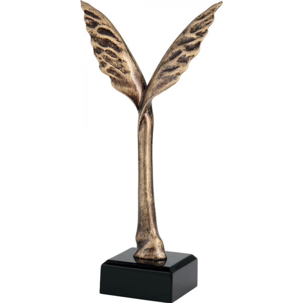 Фигурка литая "Трофей". Цвет бронза. Материал: пластик. Высота 26,5 см. Изображены два переплетенных крыла на тонкой подставке в виде ствола. Фигурка установлена на цоколе в форме квадрата, цвет черный.