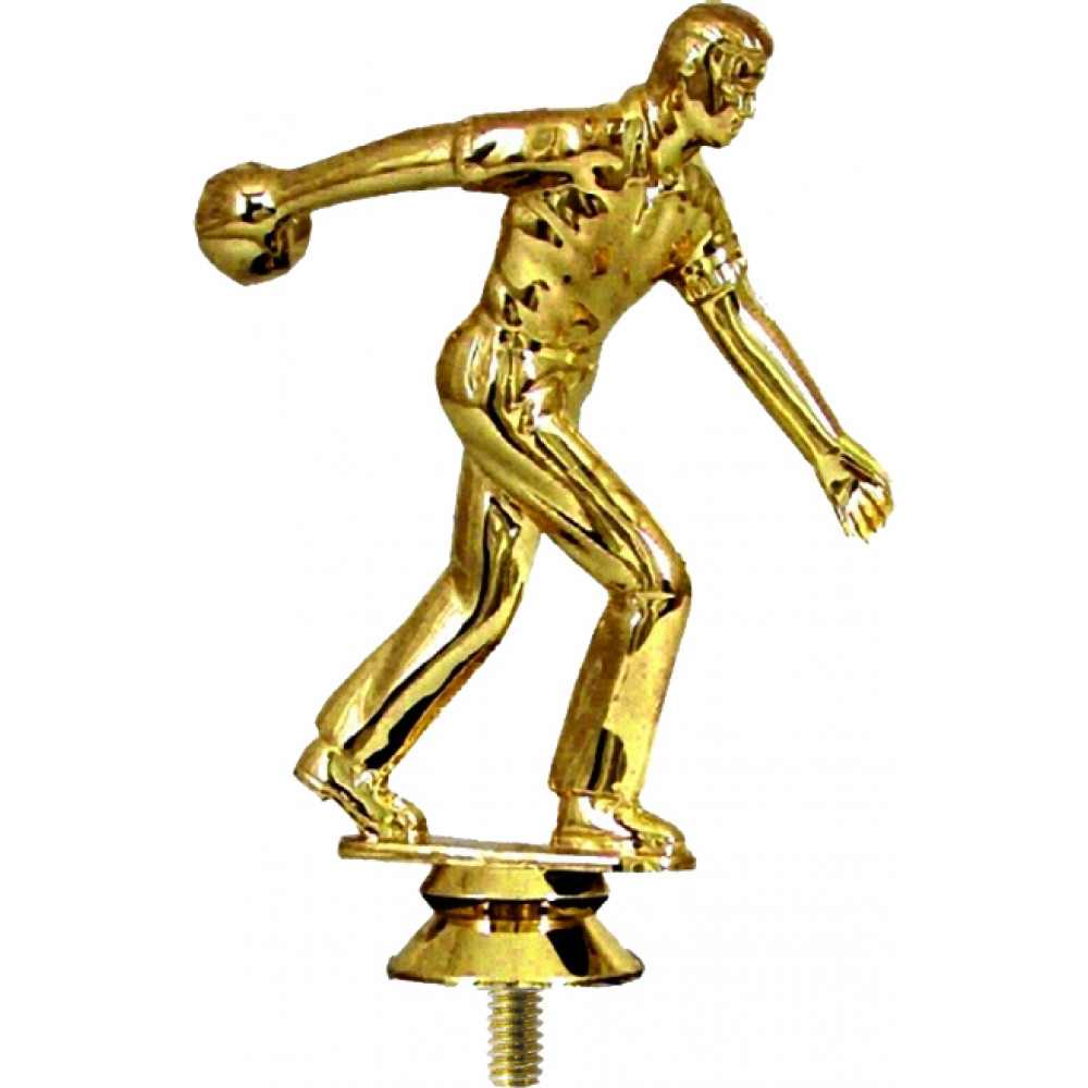 Фигурка пластиковая "Боулинг". Цвет золото. Высота 10 см. Изображен спортсмен, играющий в боулинг. Спортсмен одет в штаны и поло. Ноги немного согнуты в коленях, спортсмен будто делает шаг. Левая рука вытянута вперед, правая рука отведена назад и держит шар для боулинга.¶Фигурка установлена на стеме в виде небольшого элемента конусообразной формы. Фигурку возможно закрепить на цоколь, постамент или кубок.