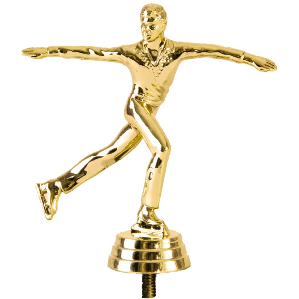 Материал пластик, цвет золото. Вид спорта: фигурное катание. Фигурка выполнена в виде мужчины на коньках, заходящего на прыжок. Его левая нога согнута в колене, а правая замерла сзади в воздухе. Корпус фигуриста повернут в бок, руки расставлены по сторонам. Он одет в кофту с треугольным вырезом и штаны. Высота фигурки, см: 11.4. Фигурку возможно закрепить на цоколь, постамент или кубок.
