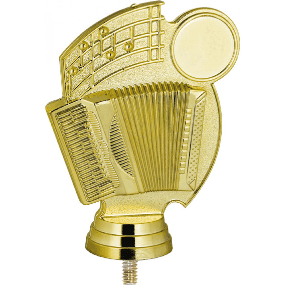 Цвет: золото, материал: пластик. Тема: музыка. Фигурка выполнена в виде круга с рифлёными краями. С левой стороны в нижней части круга имеется растянутая гармошка. От неё вверх в левой стороне отходит нотный стан с нотами. Справа имеется полый круг - место для нанесения персонализации, обрамлённый узким обручем. Круг, на котором находятся декоративные элементы, покрыт шагренью. Фигурка выполнена в золотом цвете, что придаёт ей роскоши и уникальности. Ниже - круглое основание, на котором имеются горизонтальные линии. Высота, см: 10.5 Вес, кг: 0.055. Фигурку возможно закрепить на цоколь, постамент или кубок.