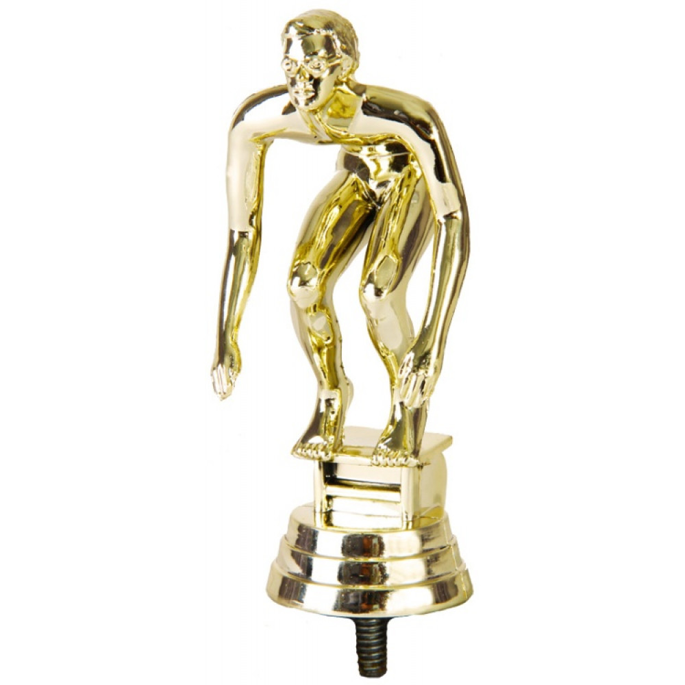 Цвет: золото, материал: пластик. Вид спорта: плавание. Фигурка выполнена в виде мужчины-пловца. Спортсмен готовится к прыжку: его ноги согнуты в коленях, пятки оторваны от земли, руки свисают расслабленно вниз. Кажется, ещё секунда и спортсмен прыгнет вводу. Взгляд пловца направлен прямо, голова поднята. Мужчина находится на краю мостика для прыжков. Ниже - круглое основание, на котором имеются горизонтальные линии. Высота, см: 11.4 Вес, кг: 0.044. Фигурку возможно закрепить на цоколь, постамент или кубок.