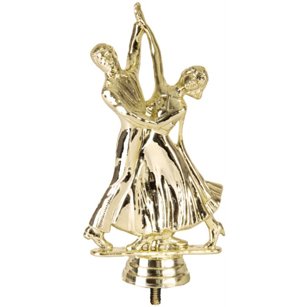 Цвет: золото, материал: пластик. Вид спорта: танцы. Фигурка выполнена в виде танцующей пары. На женщине надето длинное платье с плиссированной юбкой, рука элегантно отставлена назад, нога приподнята на носок и также отставлена назад. Ее правая рука поднята высоко вверх над головой. Партнёр копирует её движения. Его голова, так же, как и голова его партнёрши, повёрнута в сторону. Мужчина обхватывает талию женщины нежным движением. Танцоры находятся на тонкой круглой пластине – имитации танцпола. Ниже - круглое основание, на котором имеются горизонтальные линии. Высота, см: 14.9. Фигурку возможно закрепить на цоколь, постамент или кубок.
