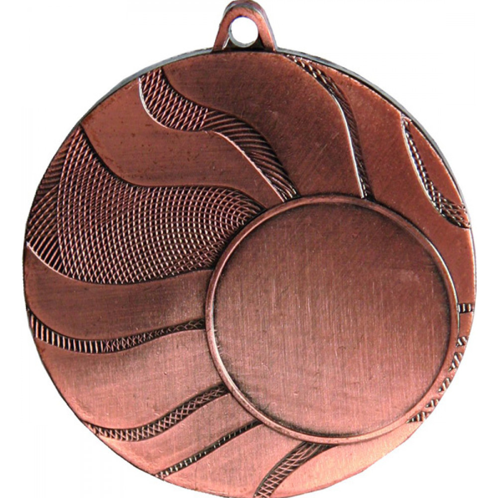 Медаль круглая металлическая. Диаметр 50 мм, толщина 3 мм.¶Цвет медали, имитирующий золото/серебро/бронзу.¶Сверху расположено круглое ушко для крепления ленты. ¶На аверсе медали расположено место под вкладку, расположенное с правой нижней стороны, имеет кант, диаметр 25 мм.¶Фон медали в виде окружностей, хаотично наложенных друг на друга. Поверх данного узора расположены толстые линии (8 штук) в виде извивающихся на ветру лент, которые отходят от правой стороны в левую.¶На медали нет никаких других изображений, нет рисунков, относящихся к конкретному виду спорта.