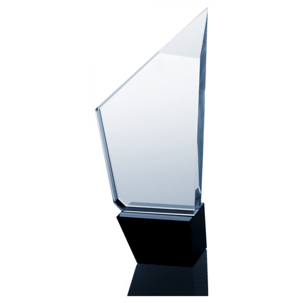 Награда хрустальная. Прозрачная. Высота 25 см. В комплекте футляр из бумвинила. Фигура в форме четырехугольника. Правый верхний угол острый, правый нижний угол 90 градусов, левый правый и инжний углы - тупые. Фигура установлена на подставку в форме усеченной пирамиды, материал - пластик, цвет- черный.