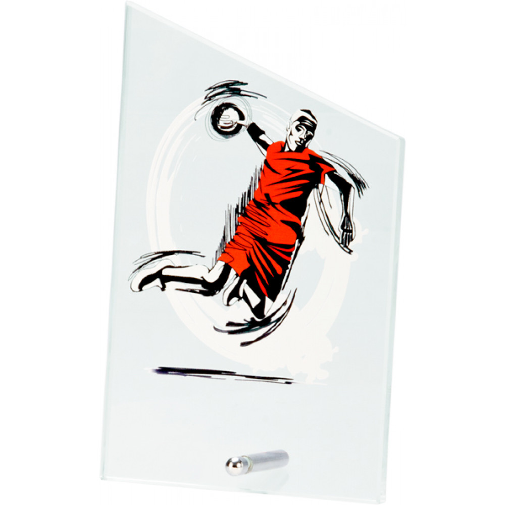 Награда стеклянная "Гандбол", цвет прозрачный. Представляет собой четырехугольник с неравными верхними углами. Левый угол острый, правый - тупой. В центре нанесено изображение спортсмена, который выполняет бросок мяча правой рукой в прыжке. Цвет изображения черно-белый, форма спортсмена красного цвета. Размер награды 12,5*20,5 см.¶В нижней части фигуры возможно нанесение персонализации.