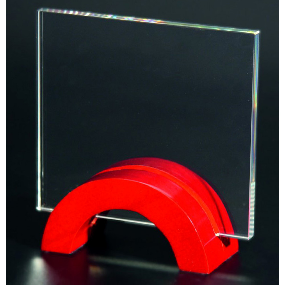 Награда стеклянная. Прозрачная. Толщина стекла 10 мм. Представляет собой плоский квадрат, установленный на подставку красного цвета в форме полукруга.