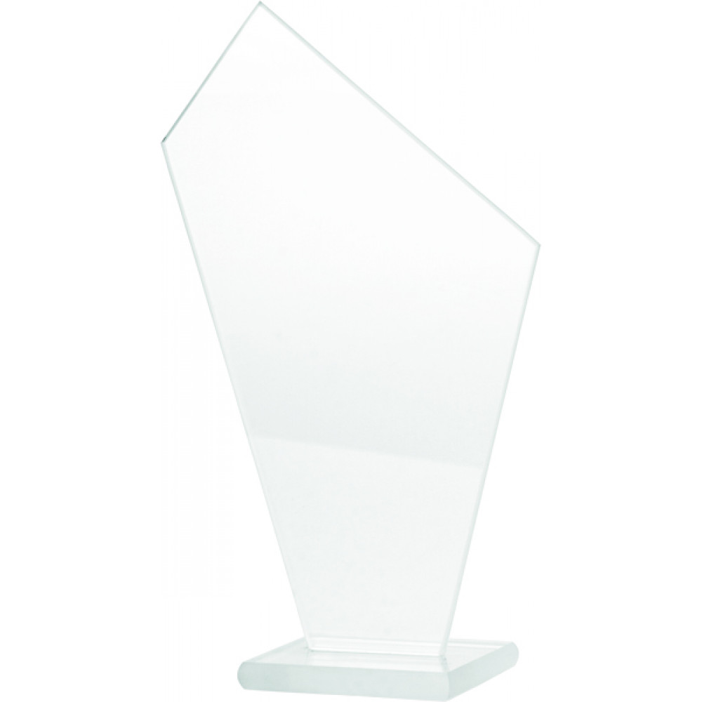 Награда стеклянная. Прозрачная. Толщина стекла 4 мм. Представляет собой пятиугольную фигуру с неравными сторонами, фигура вытянута вертикально, установлена на прямоугольную плоскую подставку.