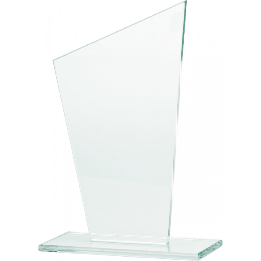 Награда стеклянная. Прозрачная. Представляет собой четырехугольник, вытянутый вертикально. Верхний правый угол фигуры острый, верхний левый - тупой. Фигура установлена на плоскую подставку в форме прямоугольника.
