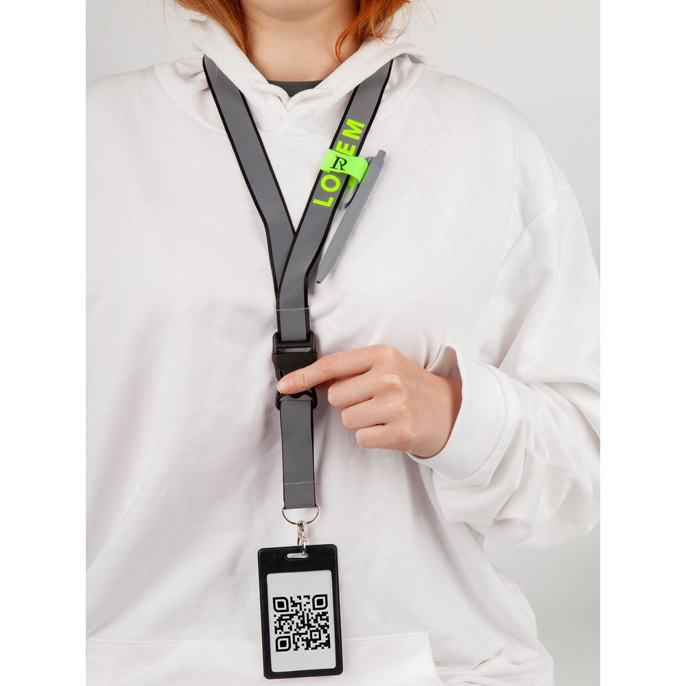 Лента для бейджа или пропуска с карабином и межъярусным замком. Такой замок позволит быстро отстегнуть часть ленты, чтобы приложить интерактивный бейдж или пропуск к считывателю, не снимая ленту через голову.