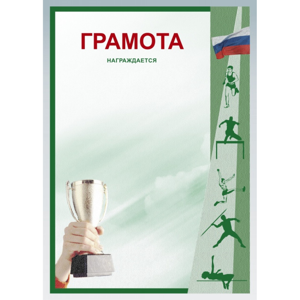 Грамота, формат А4. Бумага матовая, толщина 200 гр, полноцветная печать. ¶Фон грамоты белый с зеленым. В нижнем левом углу изображена рука, держащая кубок. В верхней части по центру написано слово "Грамота" красным цветом, под ним написано "награждается" зеленым цветом. С правой стороны грамоты расположена полоса светло-зеленого цвета, расширяющаяся сверху вниз, и полоса зеленого цвета, расширяющаяся снизу вверх. На светло-голубой полосе зеленым цветом изображены силуэты легкоатлетов в количестве 5 штук, в верхнем правом углу изображен российский флаг, извивающийся на ветру. Грамота имеет окантовку зеленого и серого цветов.¶