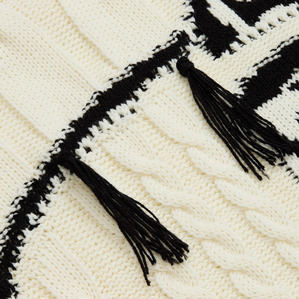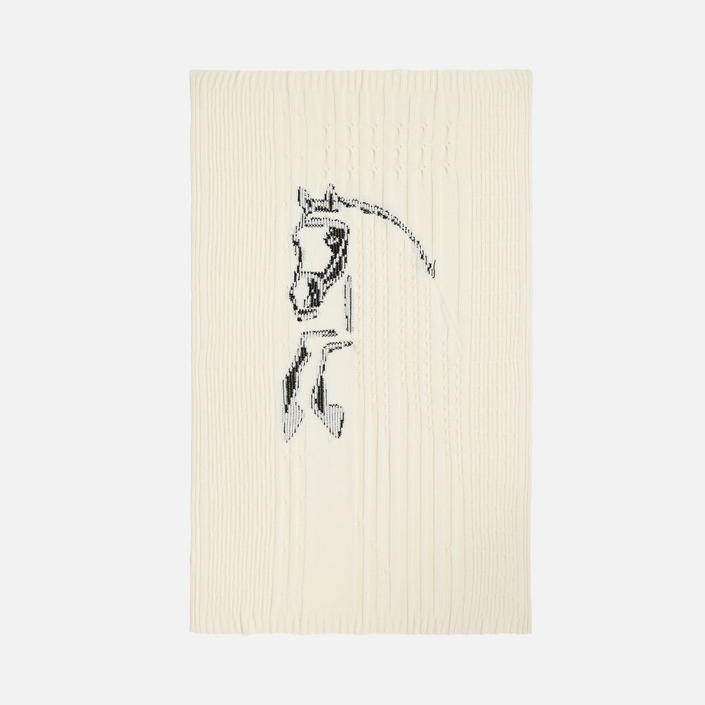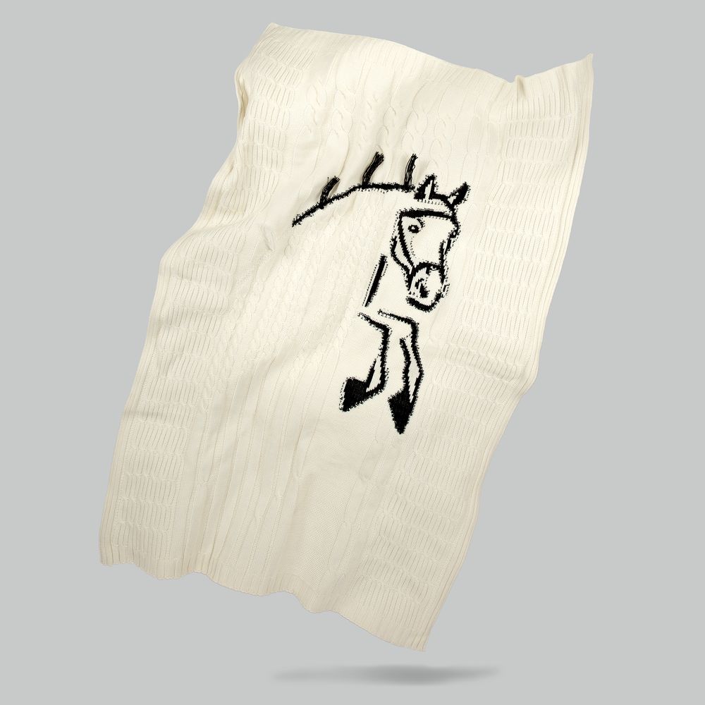 Лошадка на пледе будто встала на дыбы с согнутыми передними ногами, то есть в стойку курбет — бойкая и игривая. Дополнительного очарования и объема добавляют ей аккуратные кисточки на гриве. Словно незаконченный карандашный рисунок или эскиз, лошадь контрастно выделяется на общем белом фоне, символизируя полную готовность к грядущему году и его вызовам. А как еще встречать Новый год, если не с радостью и бурным желанием устремиться вперед?
