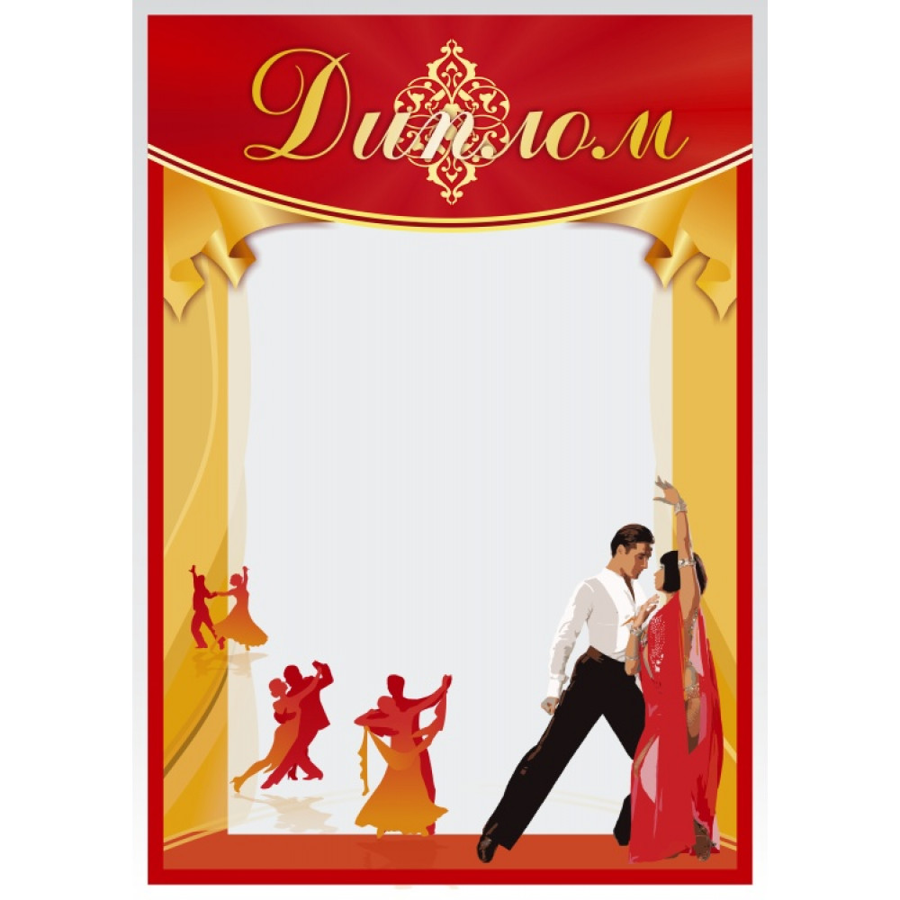 Диплом, формат А4. Бумага матовая, толщина 200 гр, полноцветная печать. ¶На дипломе изображены желтые театральные шторы, между ними белый фон, в верхней части полукругом расположен красный элемент, на котором написано слово "Диплом" курсивным шрифтом бело-желтого цвета, за словом изображен растительный узор. В нижнем правом углу изображена пара танцоров, мужчина в черных брюках и белой рубашке, женщина в красном длинном платье. На заднем плане изображены три пары силуэтов танцоров. Диплом имеет красную окантовку.¶