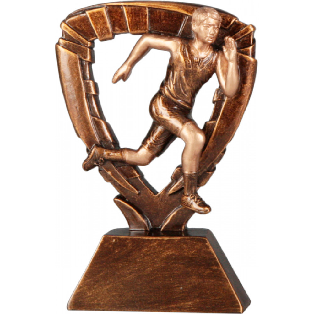 Фигурка литая "Бег". Материал пластик, цвет бронза. Высота 13 см.¶Фигурка представляет собой треугольник с широким кантом, на котором расположены четырехугольные выпуклые фигуры по периметру. В центре треугольника расположена фигура спортсмена бегуна. Фигура имеет основание в форме трапеции. Место под эмблему размером 40*25 мм.