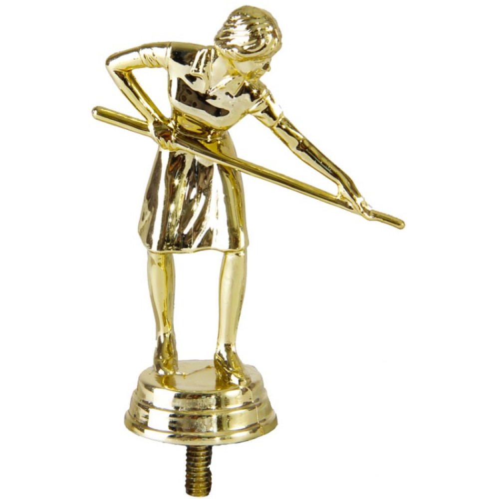 Цвет: золото, материал: пластик. Вид спорта: бильярд. Фигурка выполнена в виде женщины, готовящейся к удару по бильярдному шару. Ее правая рука согнута, левая вытянута. Пальцы зажаты на бильярдном кие. Женщина одета в удобную футболку с треугольным вырезом и юбку. Высота, см: 10.2 Вес, кг: 0.03. Фигурку можно закрепить на цоколь, постамент или кубок.