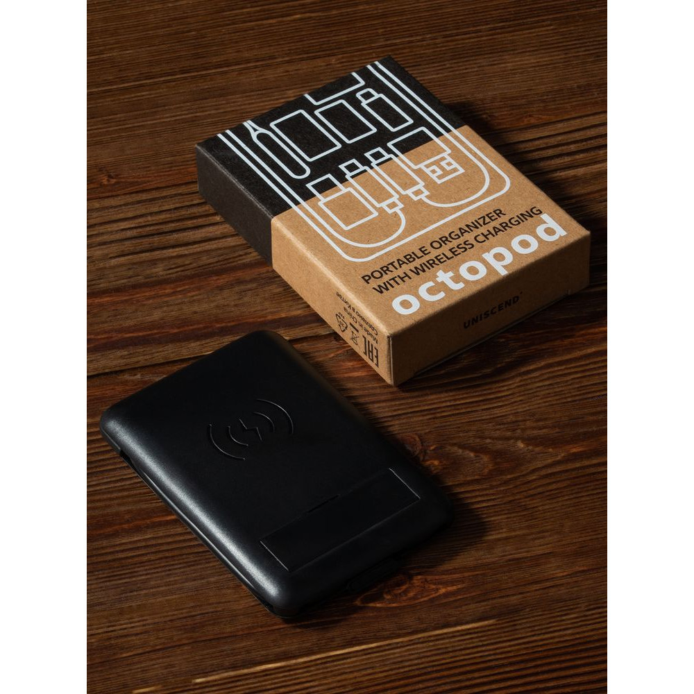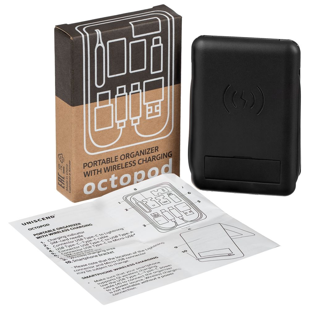 • Беспроводная зарядка работает при питании от сети. Подключение осуществляется с помощью порта Type-C, расположенного под одним из коннекторов кабеля внутри органайзера. Адаптер питания приобретается отдельно.