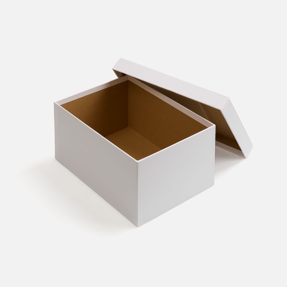 Коробка из переплетного картона, кашированного белой дизайнерской бумагой.