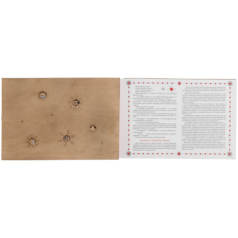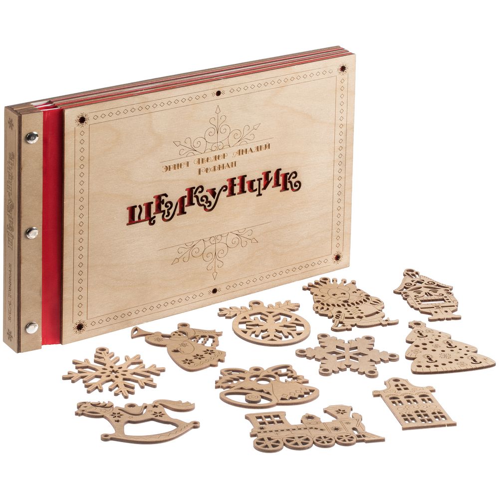 Новогодняя книга «Щелкунчик» способна вызвать тот неповторимый трепет от встречи с чем-то волшебным. Это сразу два чудесных подарка в одном необычном воплощении: резную книгу можно не только читать, любуясь каждой страницей, но и преобразовывать в настоящие деревянные елочные игрушки. Так история оживает прямо на глазах — как в лучших сказках и самой богатой фантазии, а сам презент впечатлит оригинальной задумкой и исполнением.В наборе книга Э.Т.А. Гофмана «Щелкунчик» в сокращении и 11 деревянных подвесок на елку.