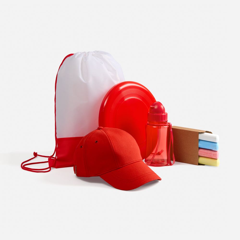 Детский набор для творчества: 4 цветных мелка, бутылка для воды, стильная бейсболка с защитой от солнца, тарелка-фрисби для самых активных и яркий детский рюкзак-мешок — все, что нужно для творческих приключений на свежем воздухе.