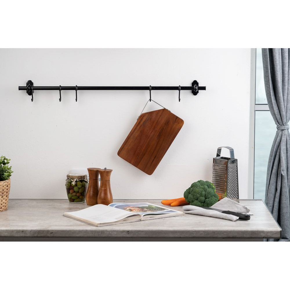 Качественная разделочная доска — необходимый предмет на любой кухне. Доска выполнена из прочного материала — древесины акации. Она обладает высокой твердостью, водоотталкивающими свойствами. Для удобства размещения на стене в верхнем углу предусмотрен подвес из металла.Доска поставляется в пакете.