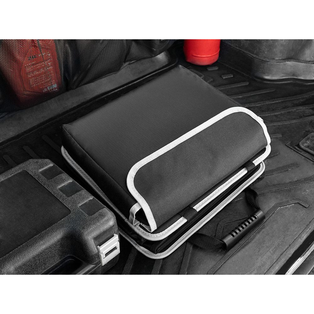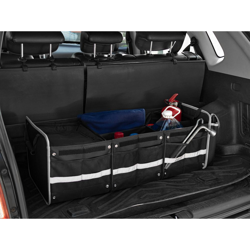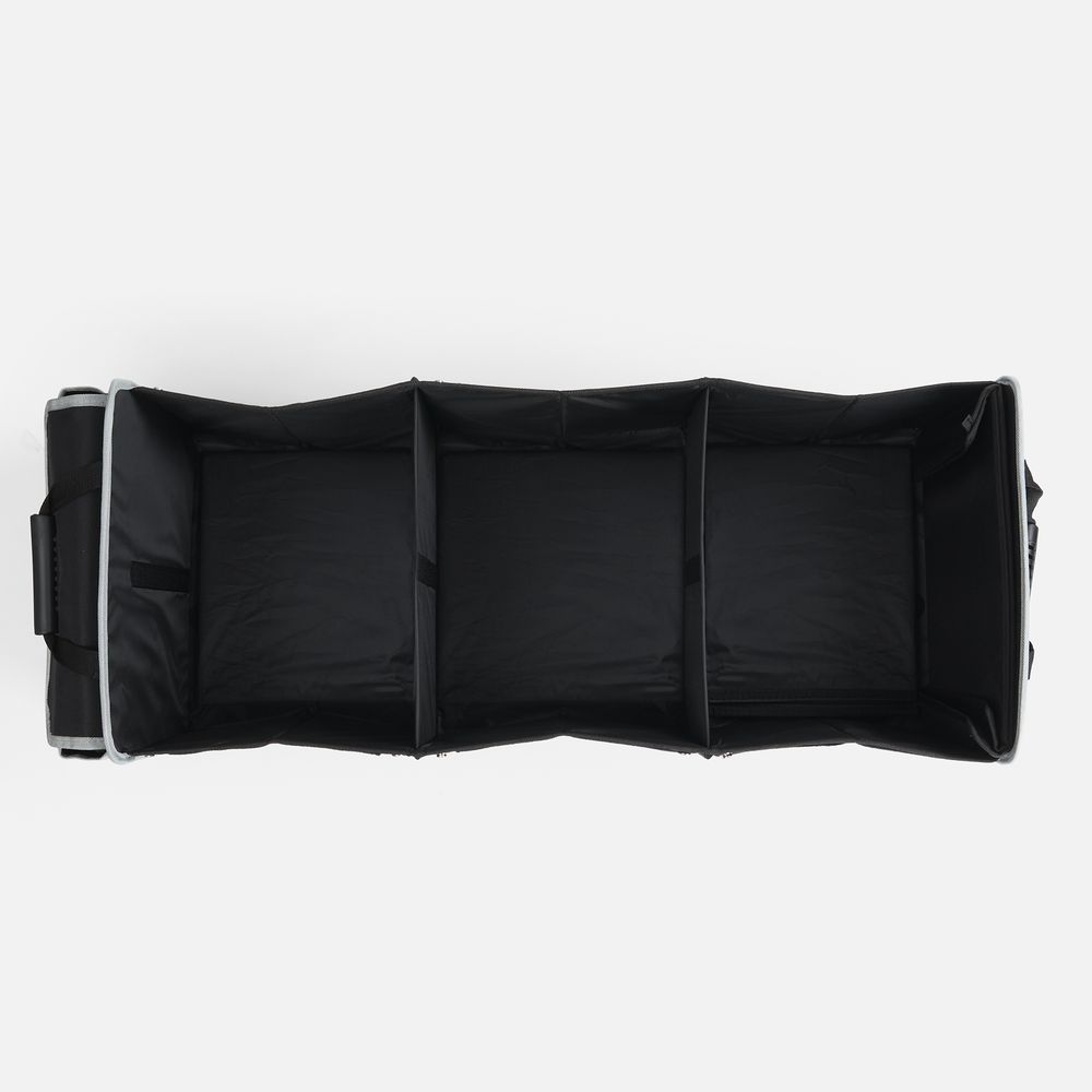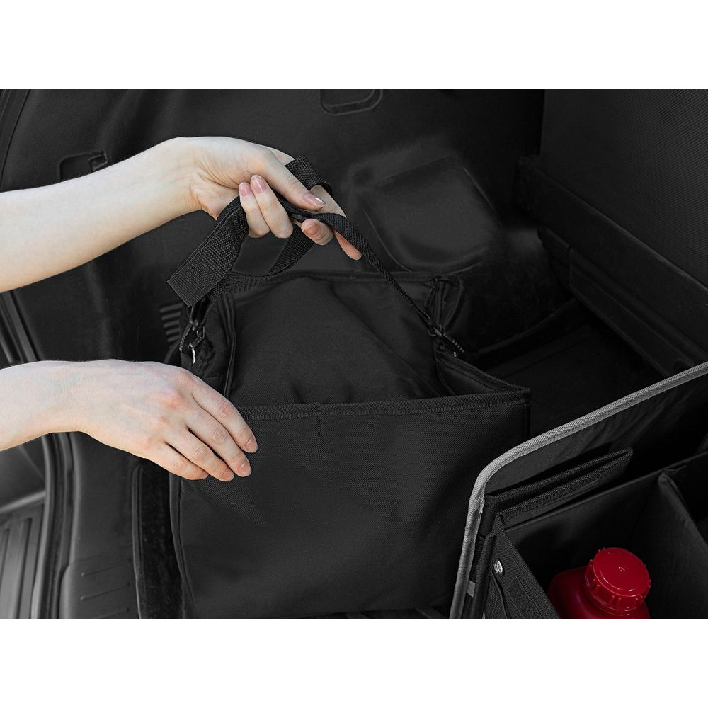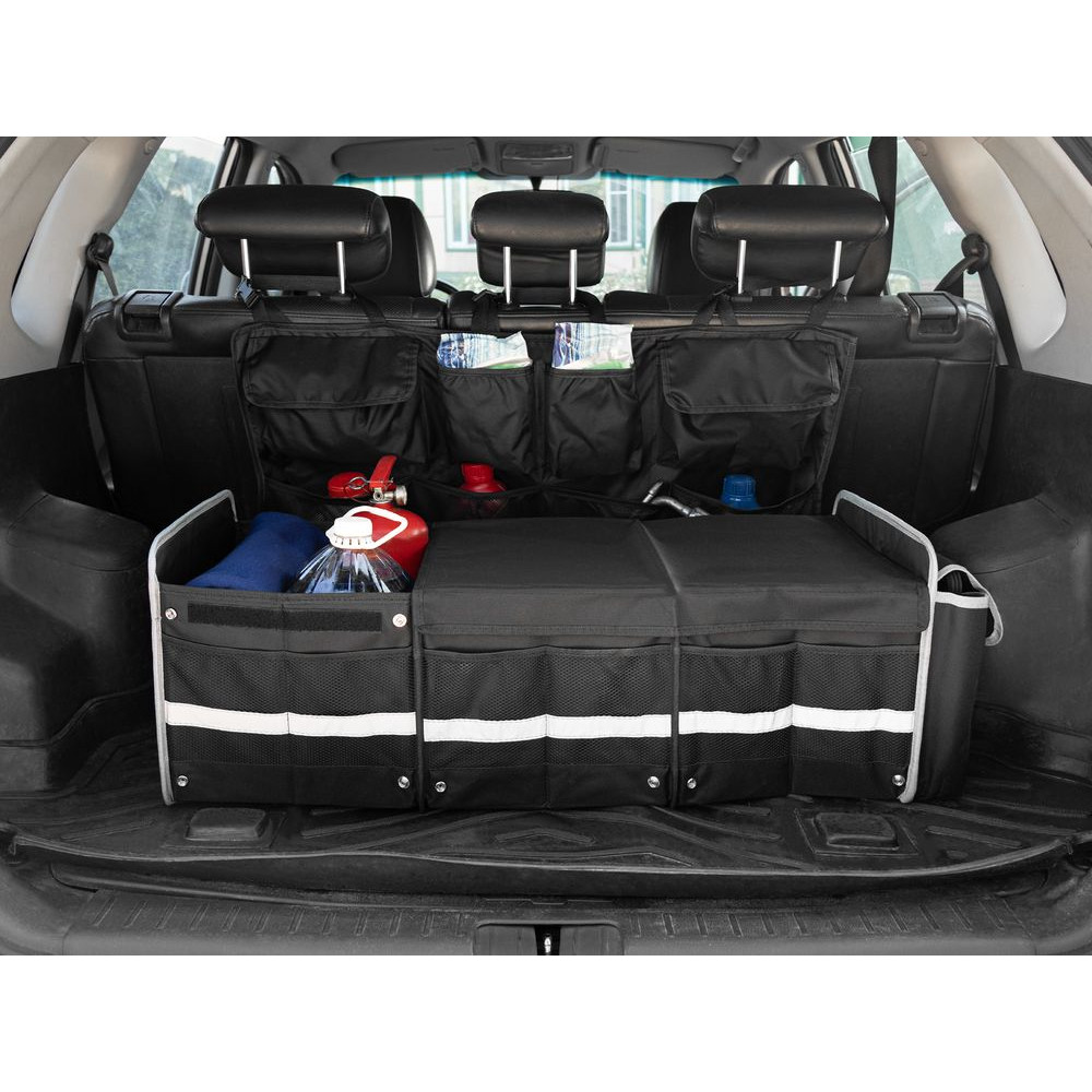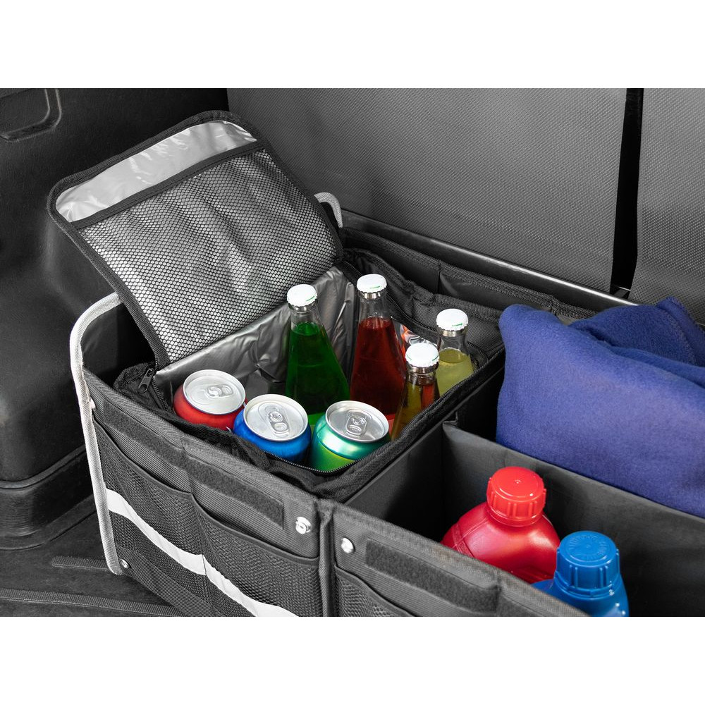 Органайзер состоит из трех основных отсеков, бокового кармана с клапаном и фронтальных карманов из сетки, что позволяет удобно хранить самые разные предметы: бутылки, сумки, инструменты, продукты и аксессуары. Также в комплект входит сумка-холодильник с водонепроницаемой подкладкой, которую можно вставить в одно из отделений, использовать отдельно, а когда она не нужна, сложить и убрать в боковой карман органайзера.