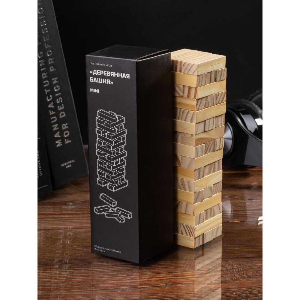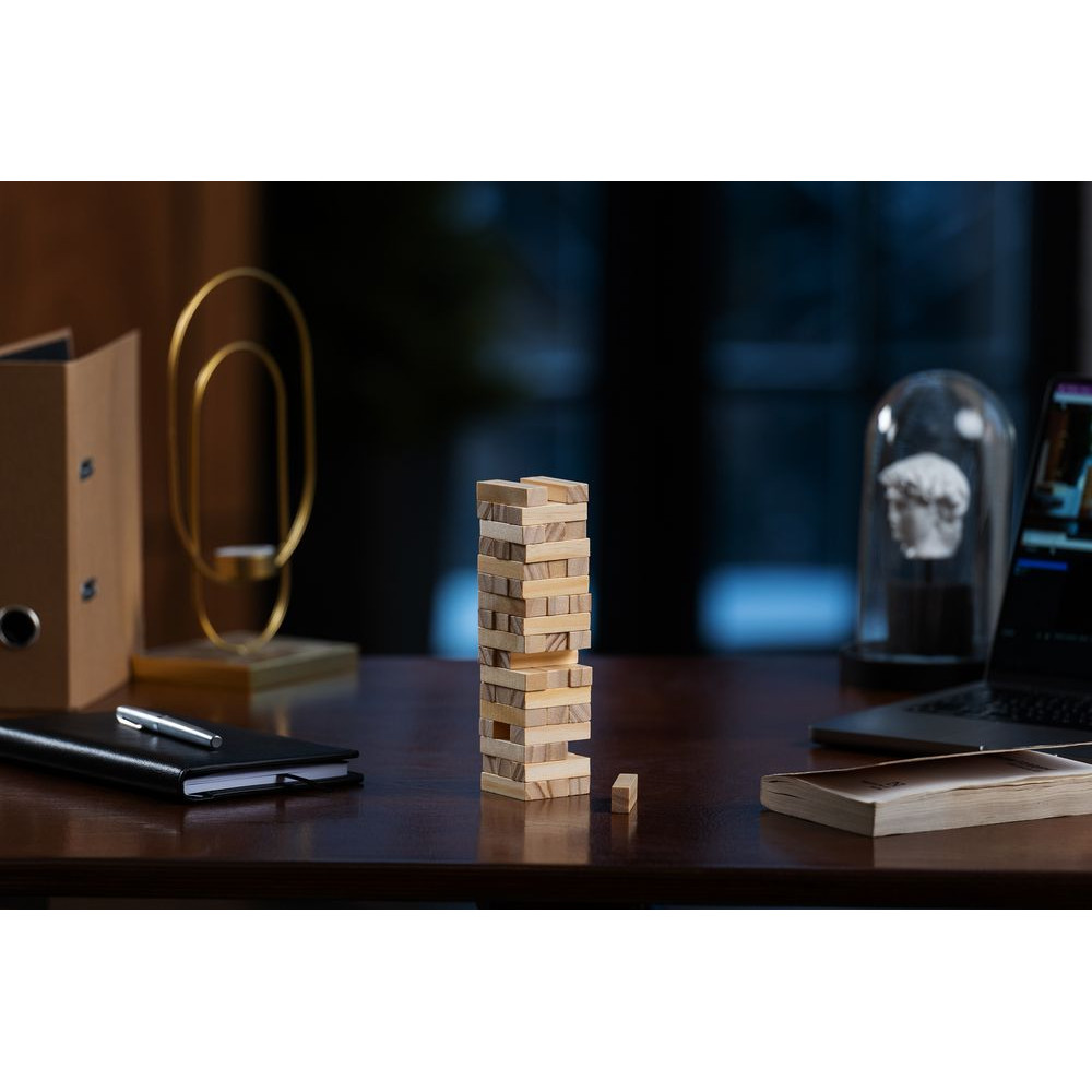 Второе название игры — «Падающая башня». Сначала строится башня: по три брусочка в ряд, каждый слой перпендикулярен предыдущему. Затем игроки по очереди вытаскивают по одному брусочку и кладут его на верх сооружения. Тот игрок, кто обрушит башню, проиграл. Игра тренирует ловкость, внимание, терпение и пространственное мышление, что очень важно и в бизнесе. Так что подарок не только развлечет, но и может стать символом-пожеланием.