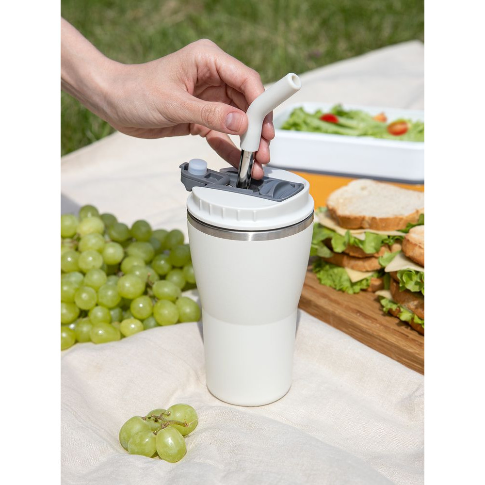 • 2 крышки в комплекте: одна на 100% герметичная с механизмом блокировки отверстия для питья, вторая — с отверстием для трубочки