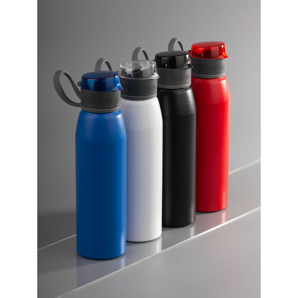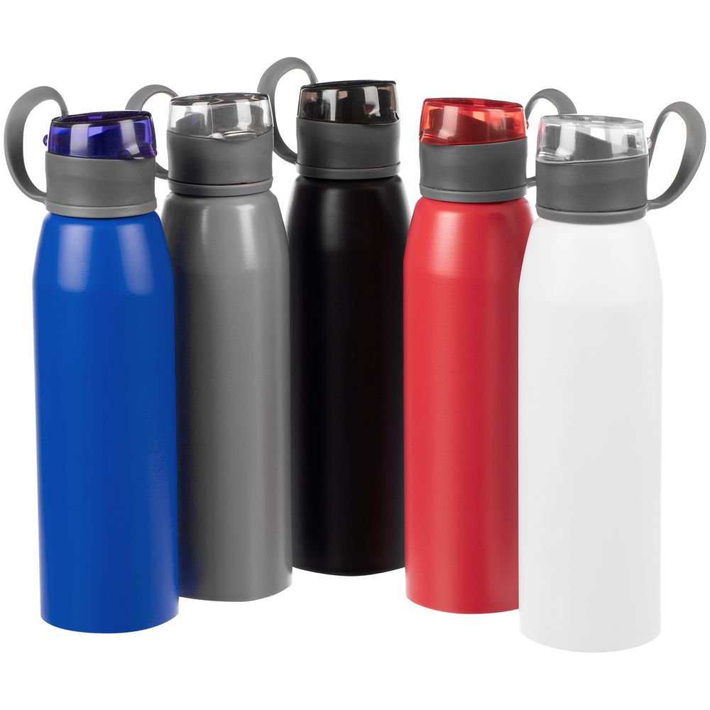 Легкая бутылка для спорта с откидной крышкой и силиконовой петлей для удобной транспортировки.