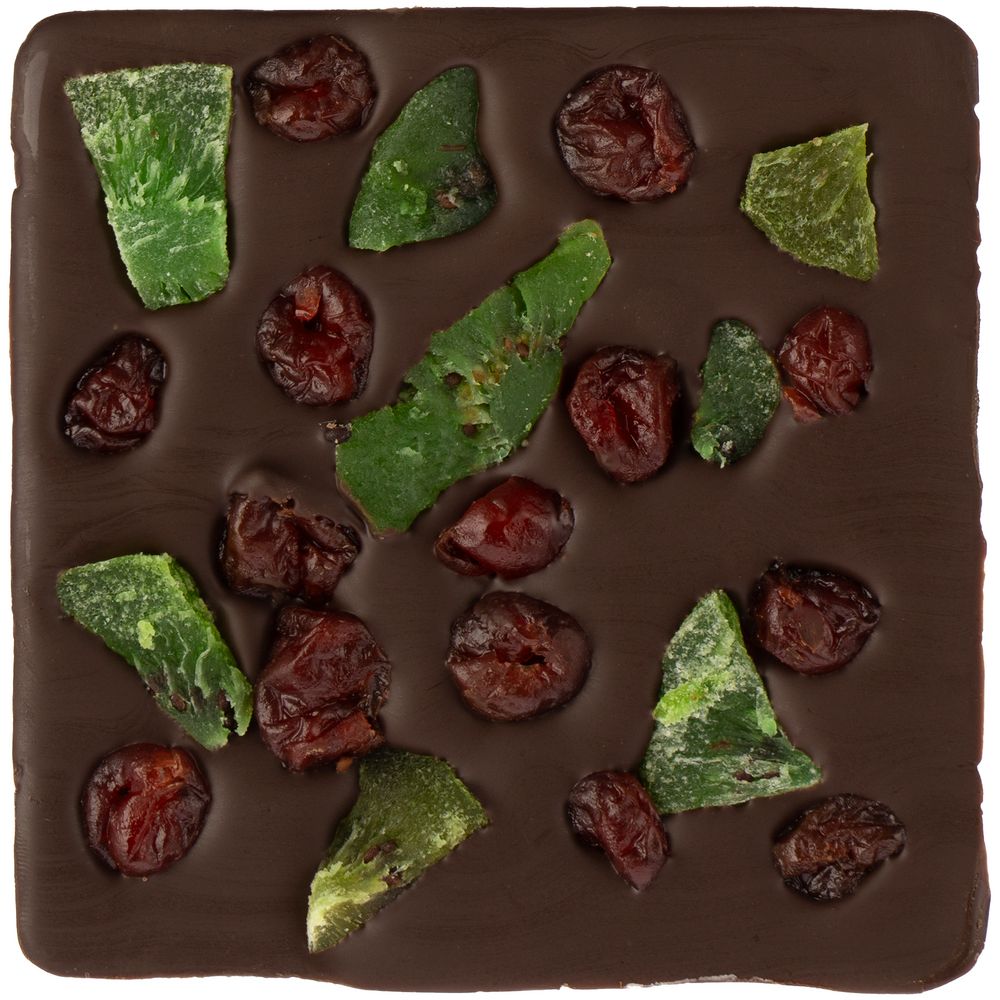 Шоколад ручной работы, изготовленный по классической бельгийской технологии, с кусочками сушеного киви и вишни.Состав: какао тертое, сахар, масло какао, эмульгатор (соевый лецитин), ванилин, вишня сушеная, киви сушеное. Темный шоколад 55%.