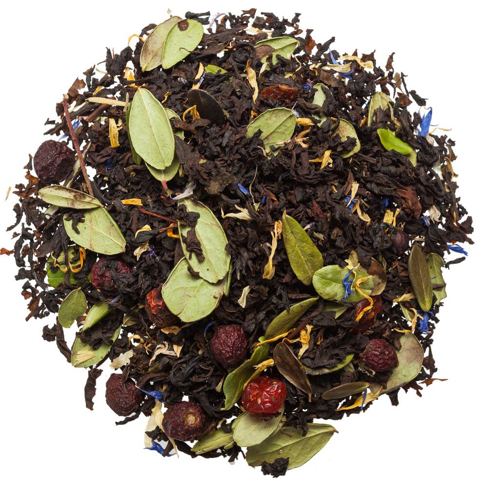 Черный индийский чай, лист брусники, мальва, календула, можжевельник, боярышник, клюква, мята, ароматизирован маслами.