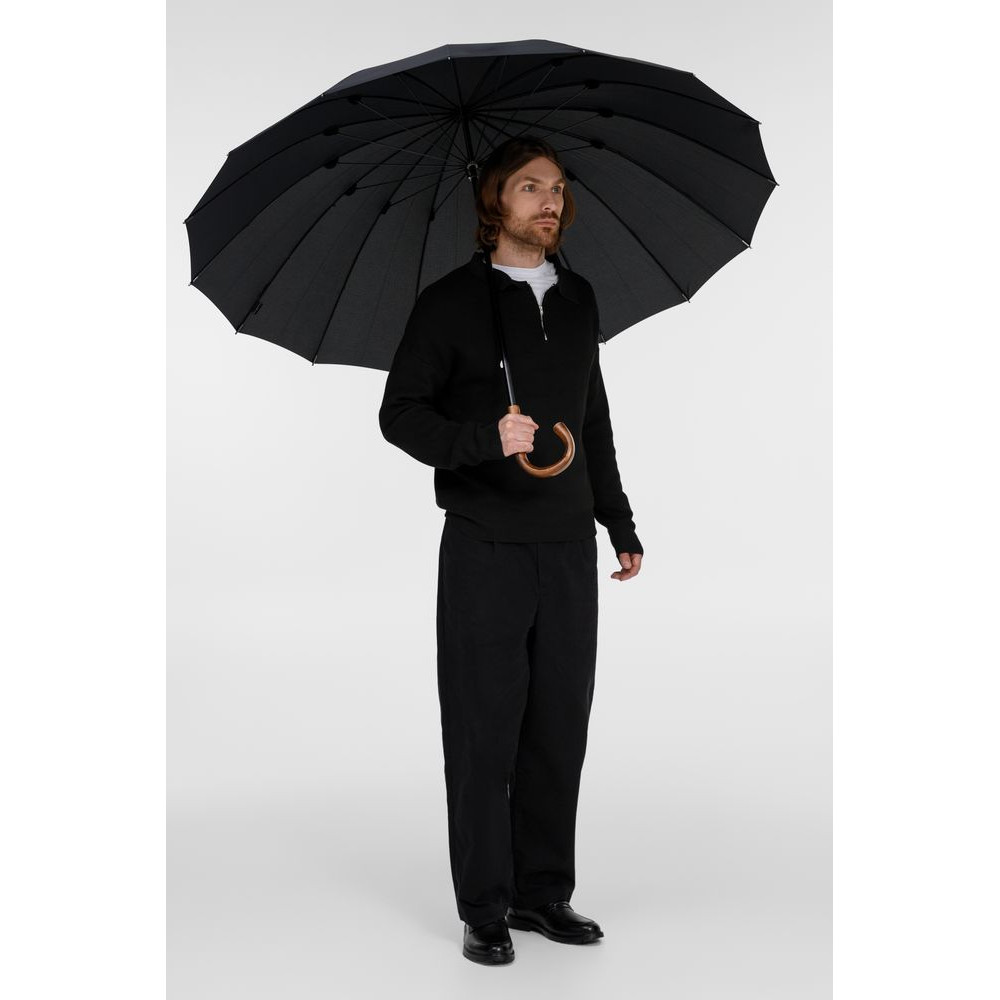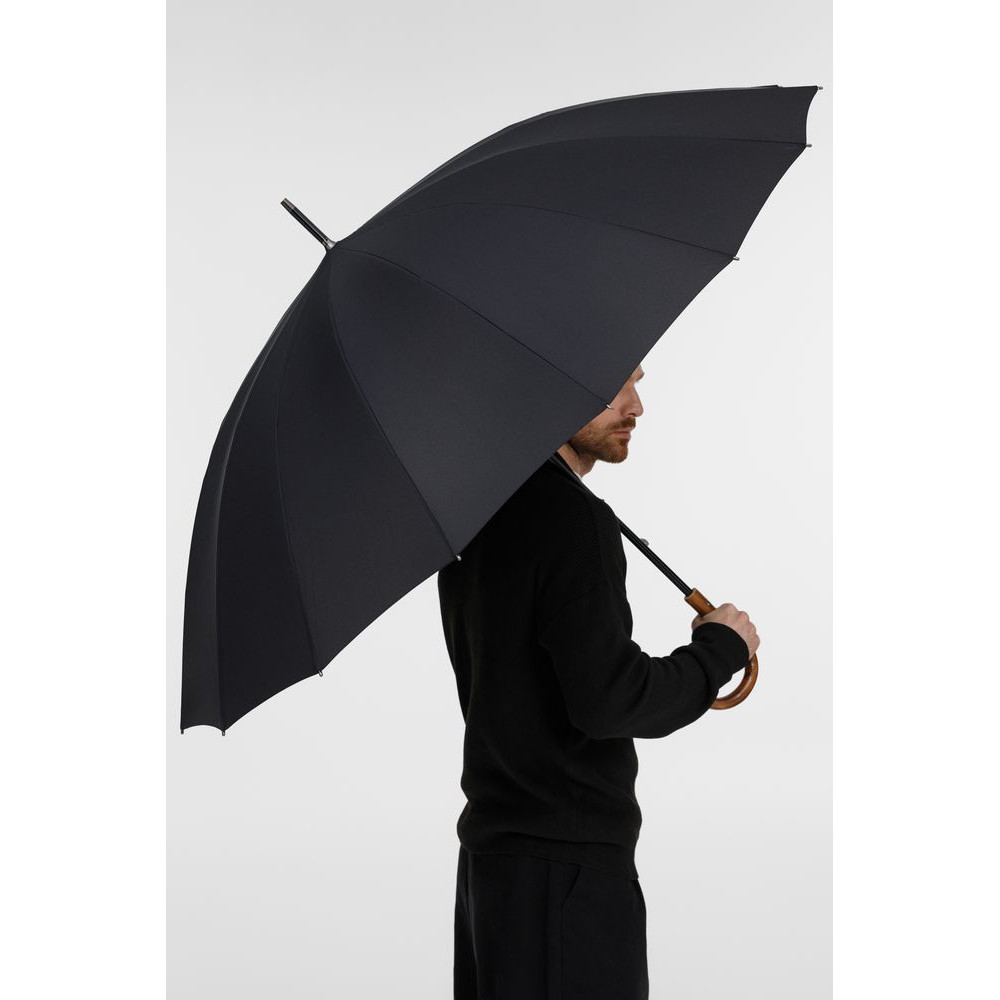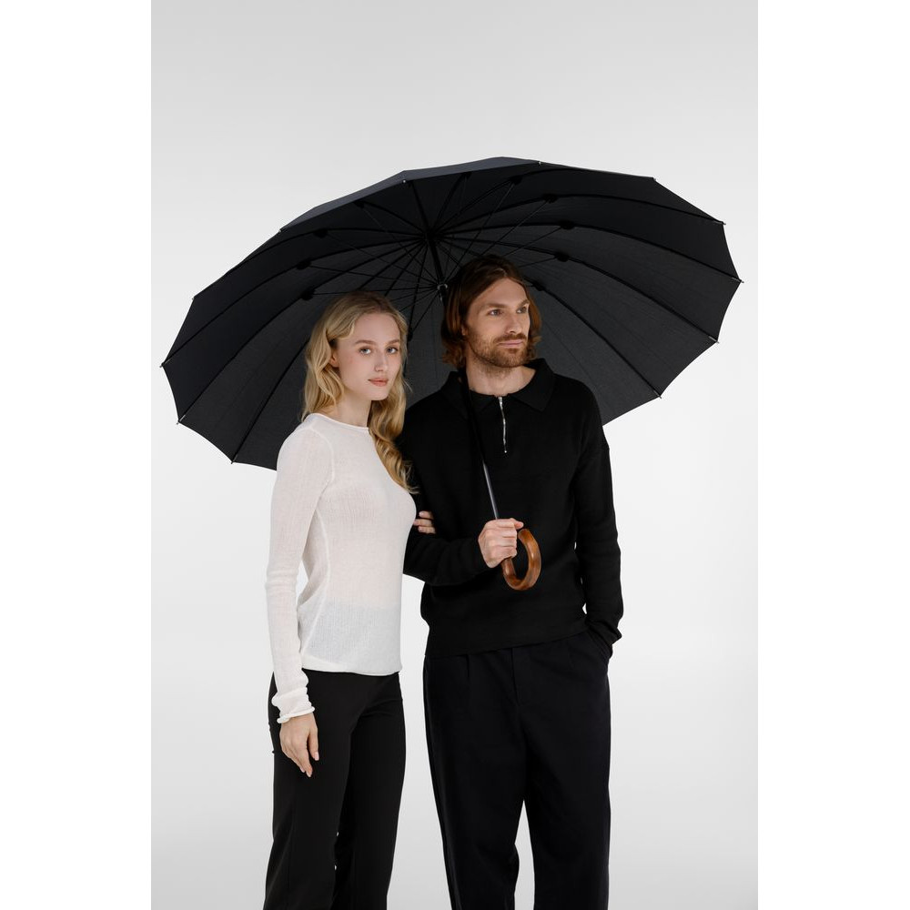 Солидный изысканный зонт с ручкой из дерева и 16 спицами. Большой купол легко укроет от дождя сразу двоих, а надежная конструкция выдержит даже сильный ветер.