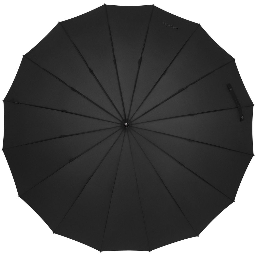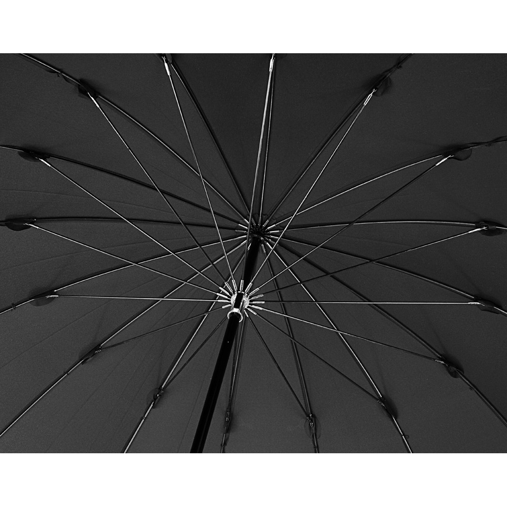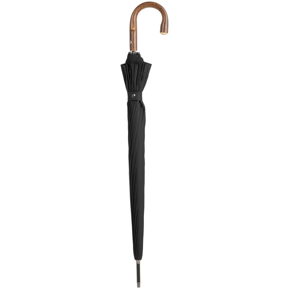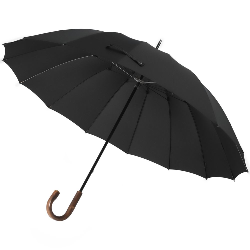 Солидный изысканный зонт с ручкой из дерева и 16 спицами. Большой купол легко укроет от дождя сразу двоих, а надежная конструкция выдержит даже сильный ветер.