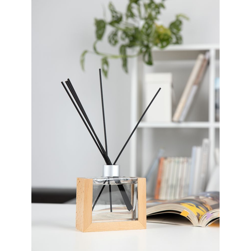 Изящный стеклянный флакон в обрамлении натурального дерева станет стильным элементом декора.